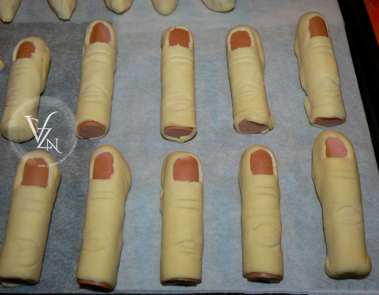 Jolis ces doigts de sorcières. Servis tiède à température du corps j’imagine? Nous on va tester avec un petit enrobage de concentré de tomate du côté de la coupure, et quelques gouttes de ketchup ou sauce tomate, pour un côté bien réaliste. Recette sélectionnée sur nos plus ensorcelantes pour Halloween: