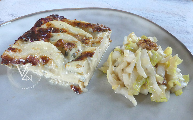 Ce gratin a une texture légère et fondante en bouche. Le roquefort vient contre balancer le sucré de la poire, les noix apportent le croquant et la salade d’endives, la fraicheur. Avec une bonne tranche de pain de campagne, c’est le repas idéal pour une soirée cocooning 🙂
