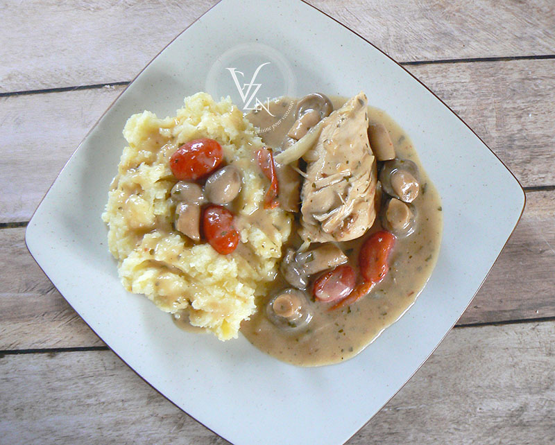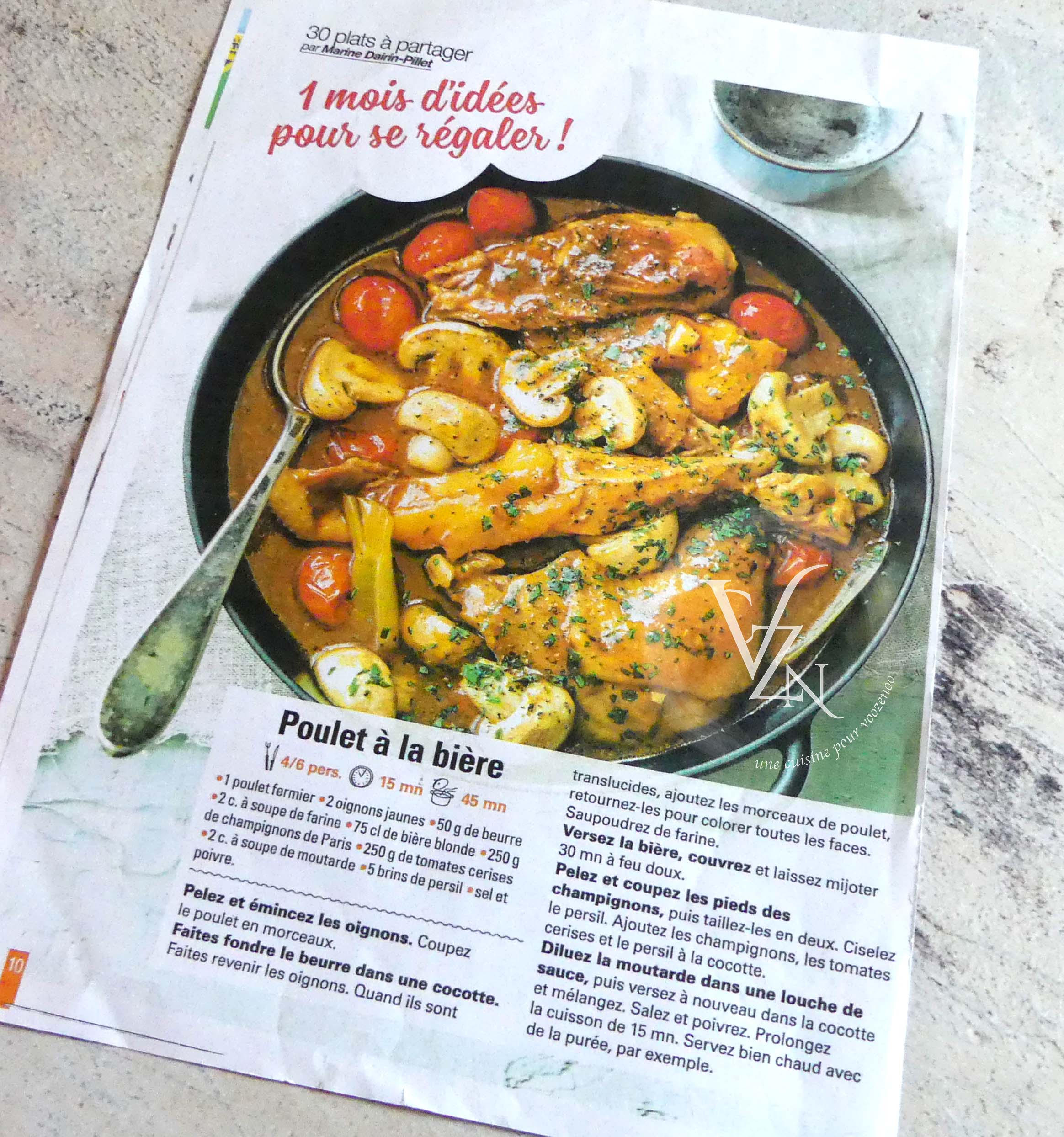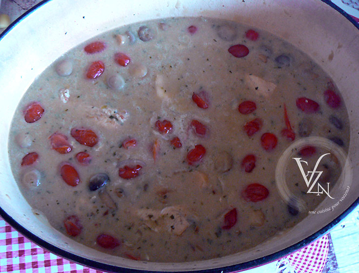 J’ai trouvé cette recette sur un « Maxi Cuisine ». J’avais une barquette de tomates cerises, j’ai remplacé le poulet par des blancs que j’avais au congélateur, les champignons frais par une boite que j’avais en stock depuis un bon moment, la bière … ça j’en manque jamais 😉 et j’ai décidé de l’accompagner avec un écrasé de pommes de terre car il me restait des pommes de terre bouillies de la veille. Un peu de lait chaud, du beurre et ça nous a fait un bel accompagnement.