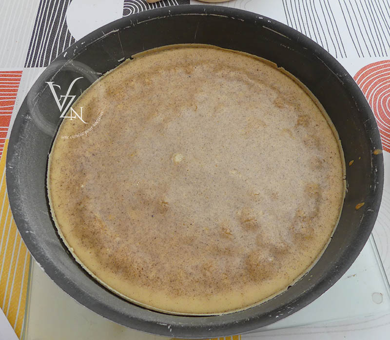 Beurrer et fariner un moule à manque de 23 cm. Verser dans le fond du moule, 1 cm de pâte et enfourner juste pour 5 mn, le temps que la pâte prenne un peu.