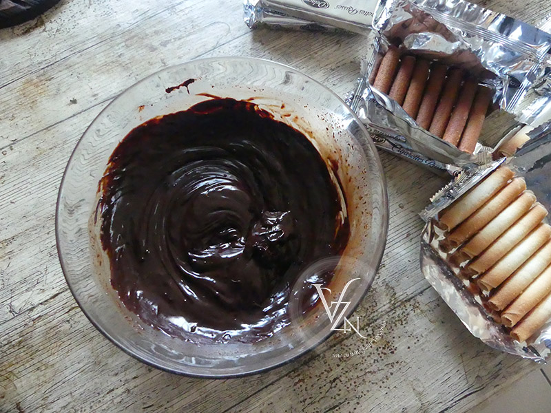 J’ai trouvé cette fois-ci des « cigarettes Russes » aux spéculoos, je les ai alterné avec les classiques. Il m’arrive aussi de glisser dans le chocolat, un bouchon de Rhum, de Whisky, de Grand Marnier … c’est encore meilleur 😉