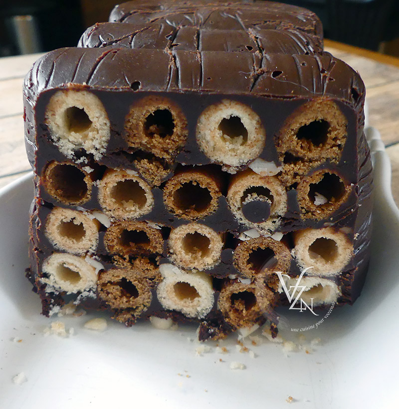 Une recette facile, sans cuisson (sauf de faire fondre le chocolat), 4 ingrédients et un peu de montage. On obtient de belles tranches qu’on peut couper en petits morceaux pour en faire des bouchées à picorer 🙂 .. elles font parties de mes assortiments de mignardises. Le chocolat est à la fois ferme et crémeux, les biscuits bien croustillants et les cacahuètes ajoutent une belle note.