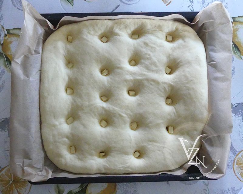 Avec le pouce, appuyer sur la pâte pour créer de petites cavités comme un coussin. Déposer dans chacune des noisettes de beurre.