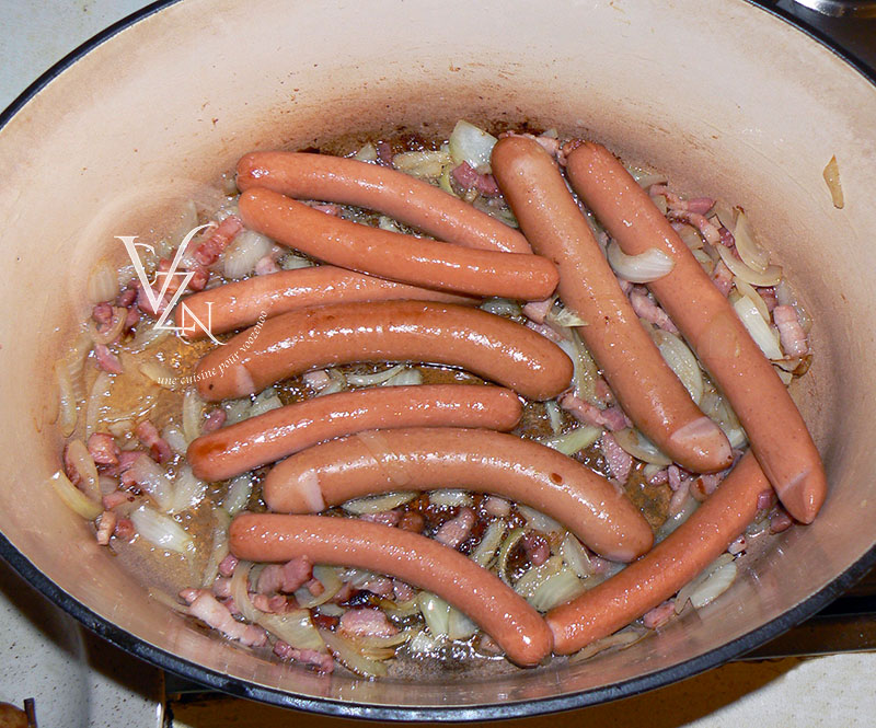 Déposer les saucisses de Strasbourg et les knack dans la marmite et les faire revenir 5 mn, les lever.