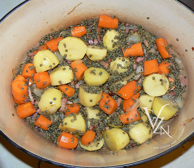 Ajouter les pommes de terre et les carottes, mélanger puis verser les lentilles.