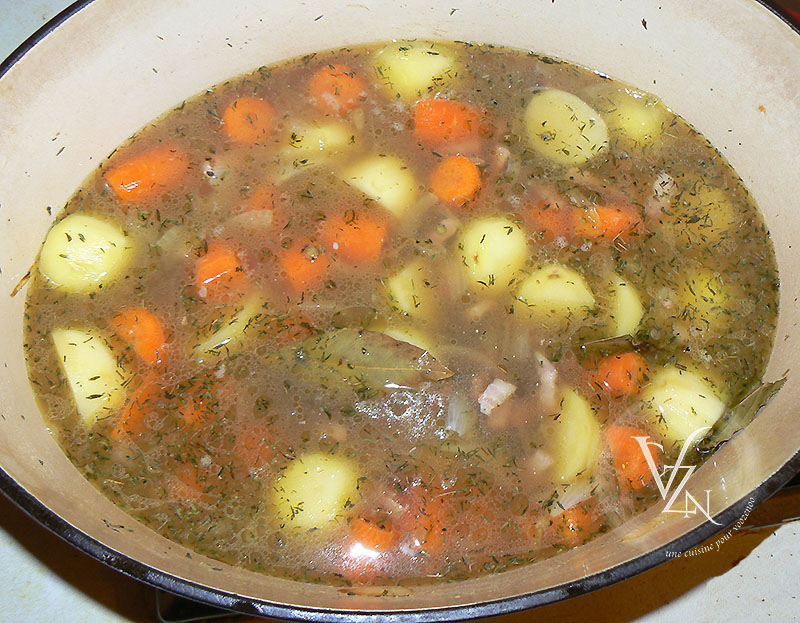 Verser l’eau, mettre le bouquet garni, le laurier, glisser la saucisse de Morteau et porter la marmite à ébullition. Baisser le feu, couvrir la marmite et laisser cuire 20 mn.