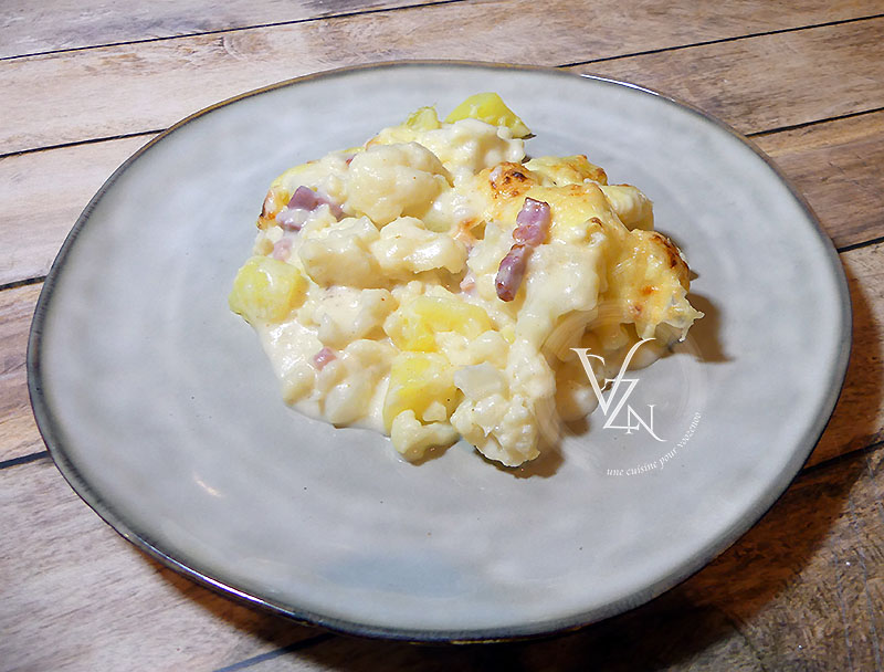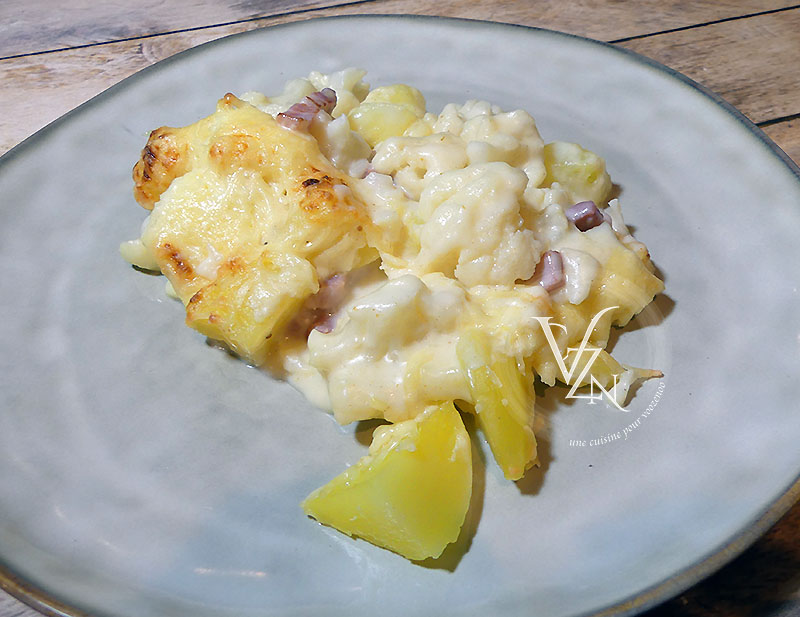 Ce gratin fait parti des souvenirs d’enfances. Ma mère le faisait souvent, toujours accompagné de côtes de porc poêlées. Elle le nommait « Gratin de chou-fleur, pommes de terre à la béchamel ». Mais je ne le voyais pas aussi simple que ça, je savais que pour la béchamel, elle ajoutait quelque chose.