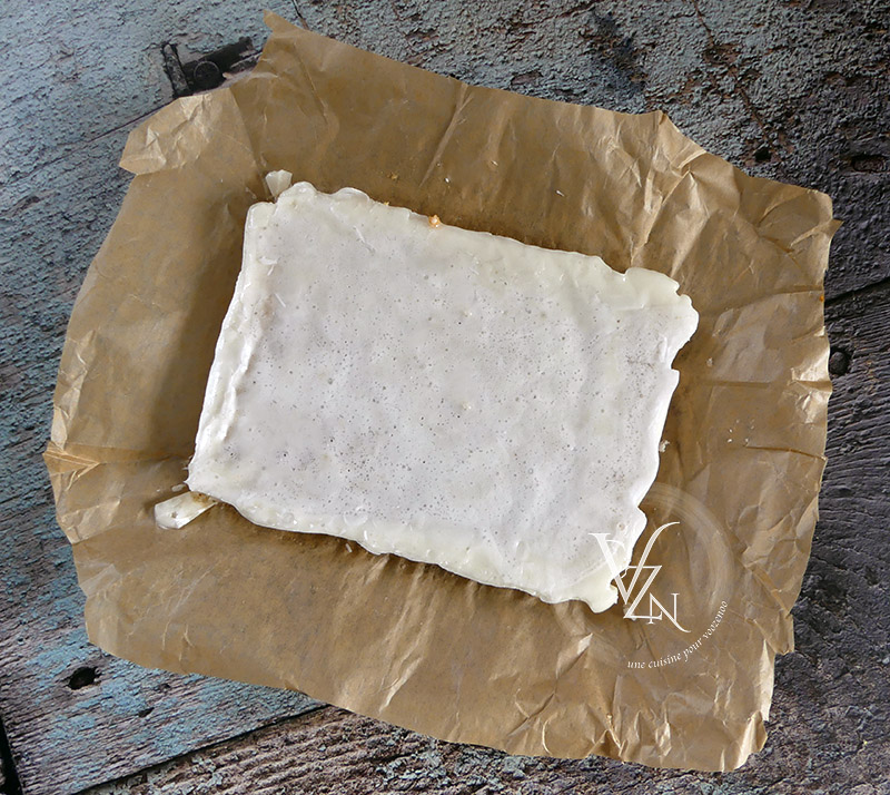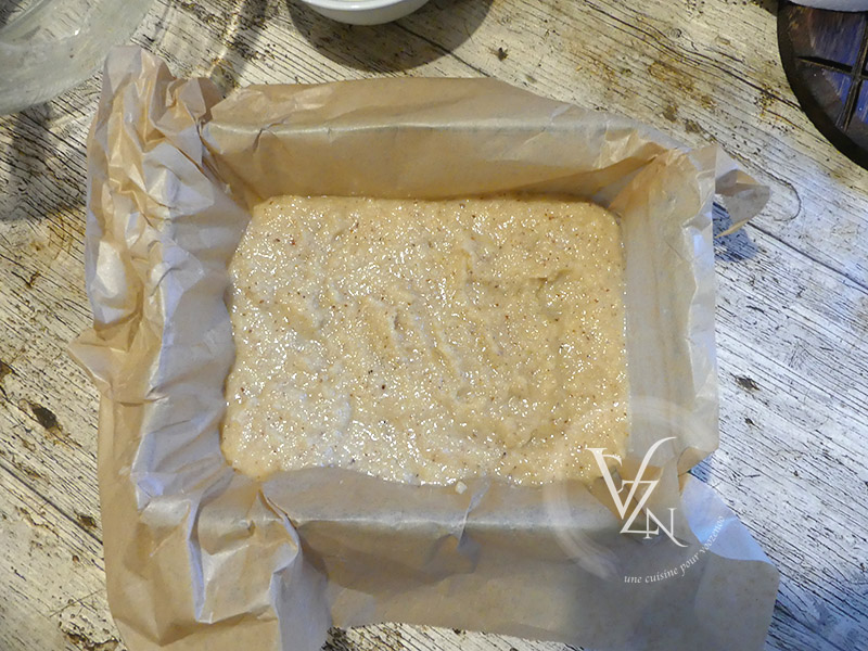Chemiser un moule (20×18) de papier de cuisson et verser la pâte dedans. Elle doit avoir une épaisseur de 3 à 4 cm.