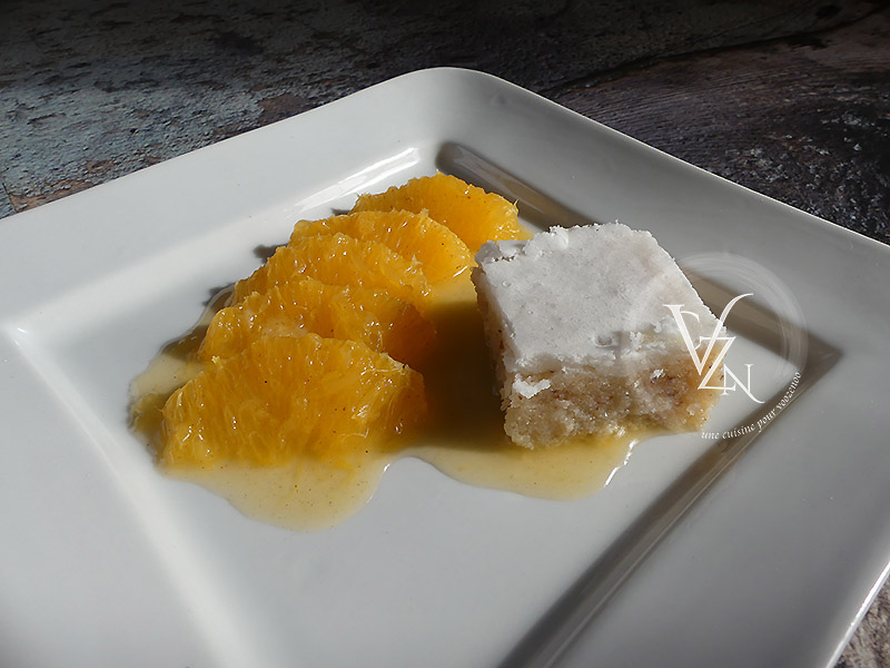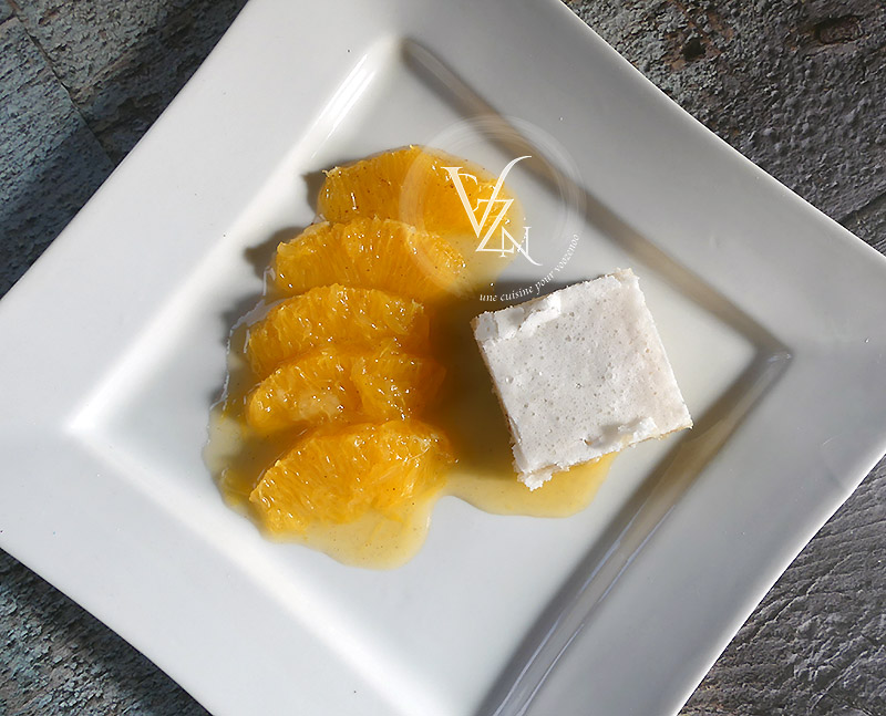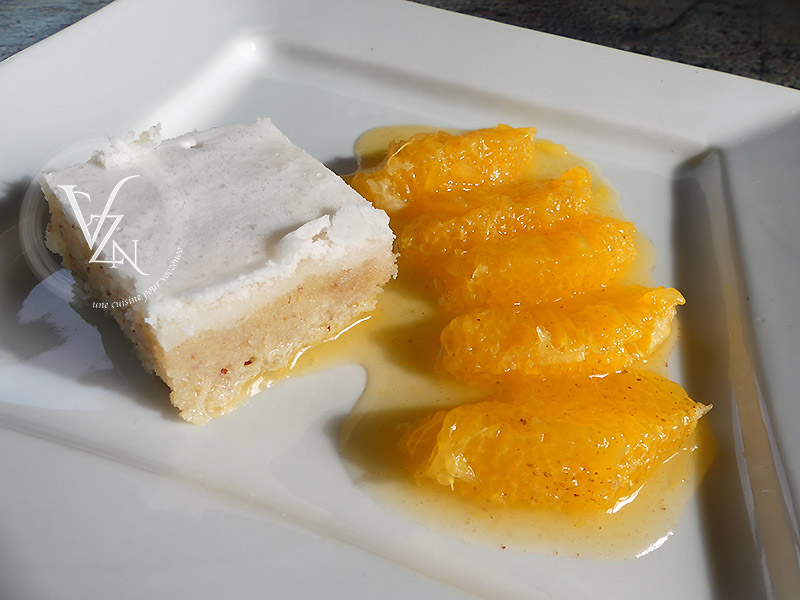 Mais quelle assiette !!!! J’apprécie tout autant ce massepain moelleux et délicat que la salade d’oranges. Si cette dernière revient sans arrêt à table en hiver, je n’ai jamais pensé à l’associer au massepain d’Issoudun que je connais bien : une idée géniale !