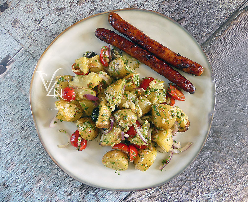 J’ai choisi de servir cette salade avec des chipolatas, elle peut aussi se déguster avec des œufs mollets ou sans rien.