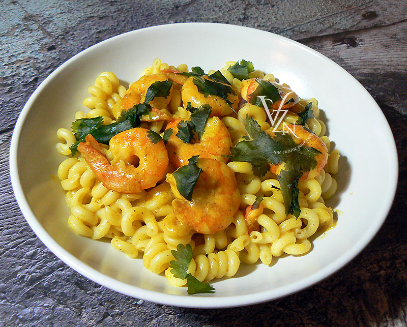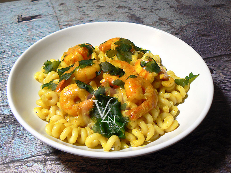 Lait de coco, crème de soja, curry, coriandre et crevettes, il n’en faut pas plus pour réaliser ce plat de pâtes façon indien, simple, rapide et très gourmand.