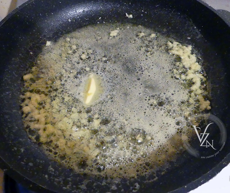 Presser les gousses d’ail dans la poêle et mélanger au beurre.