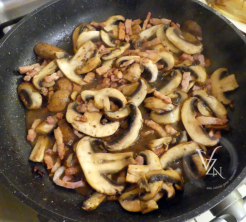 Mettre les champignons dans la poêle, ajouter les lardons fumés, poivrer et bien mélanger.