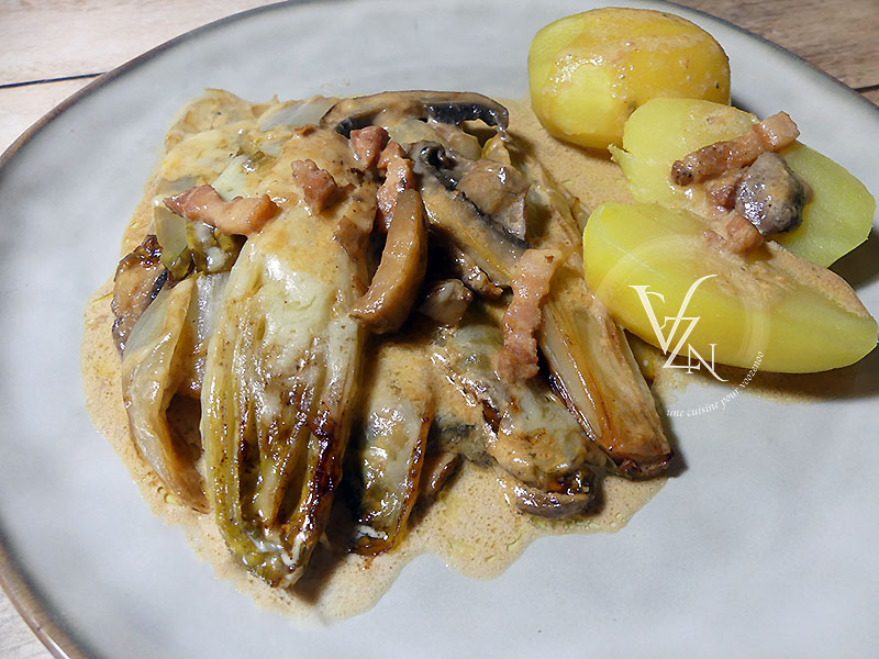 Pour ce défi, j’ai choisi une recette qui est vraiment excellente ! Les endives sont fondantes, elles ont pris le goût des champignons et de la crème bien fromagée. On peut bien sûr changer le fromage selon ses goûts. Servi avec des pommes de terre vapeur, c’est le mariage parfait. Une recette que je referais sans hésiter.